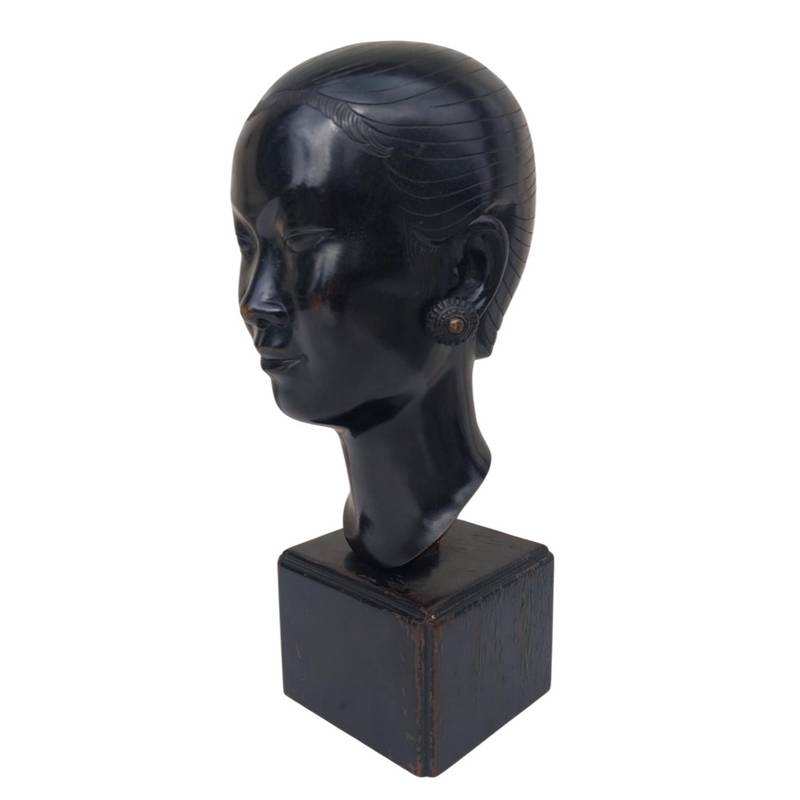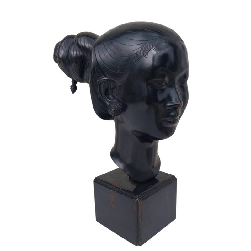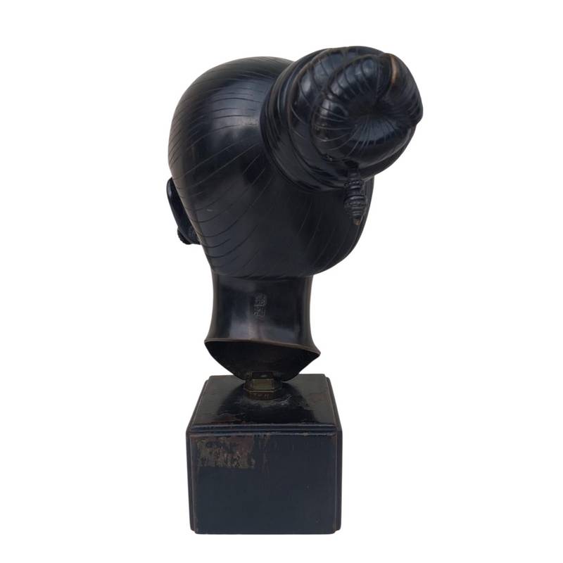 Bronze Indochinois représentant une tête de Laotienne sur son socle en bois.